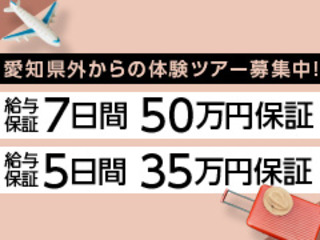 | 特典 | 体験入店の宿泊費・交通費はお店が負担。 お給料は全額日払いです。 体験入店ツアー最大7日間50万円完全保証コースもご用意しております。 |