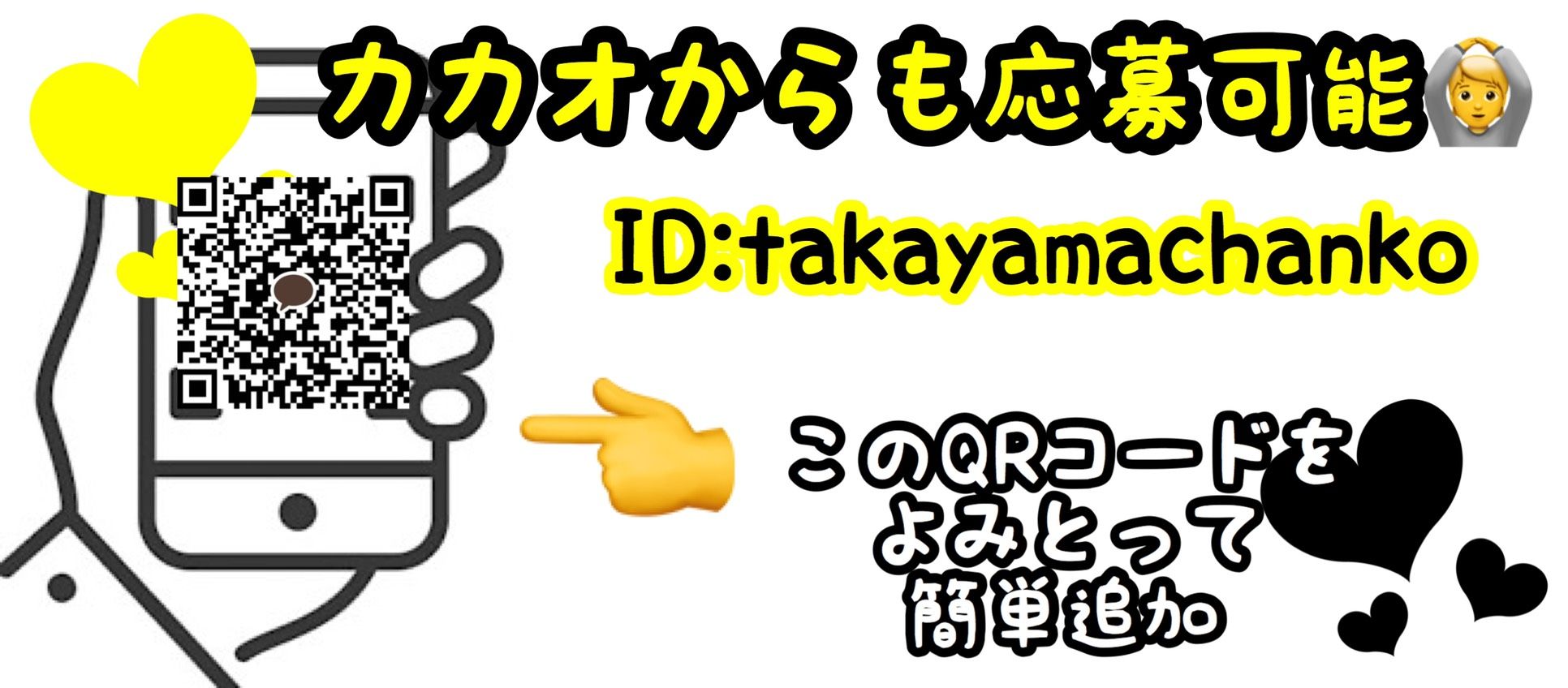 LINEのようなSNSだと 応募もかんたんで楽なのがメリットではありますが、 LINEは知られたくない。 そんな方もいらっしゃるのではないのでしょうか! そんな方必見☆ カカオトークでも応募が可能になりました!! 電話番号も、LINEも知られずにかんたんに応募が可能!! 質問だけでも構いませんのでお気軽にお問い合わせください!! カカオトークID:takayamachanko